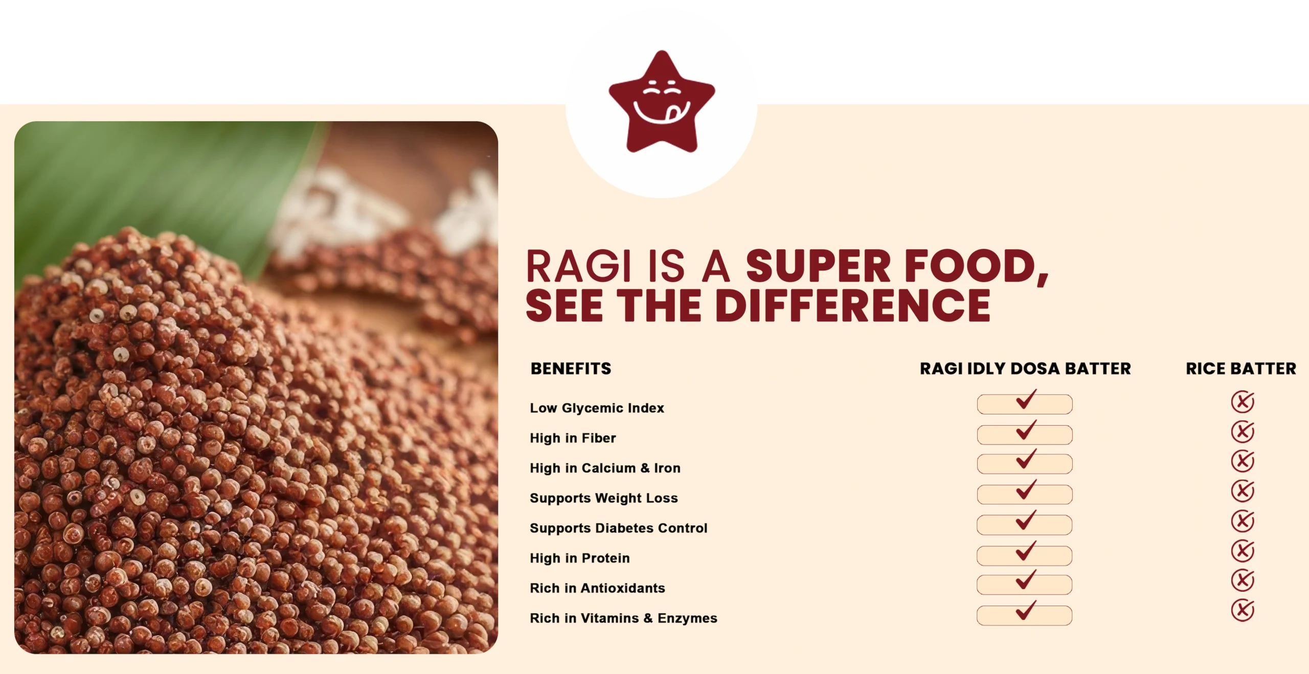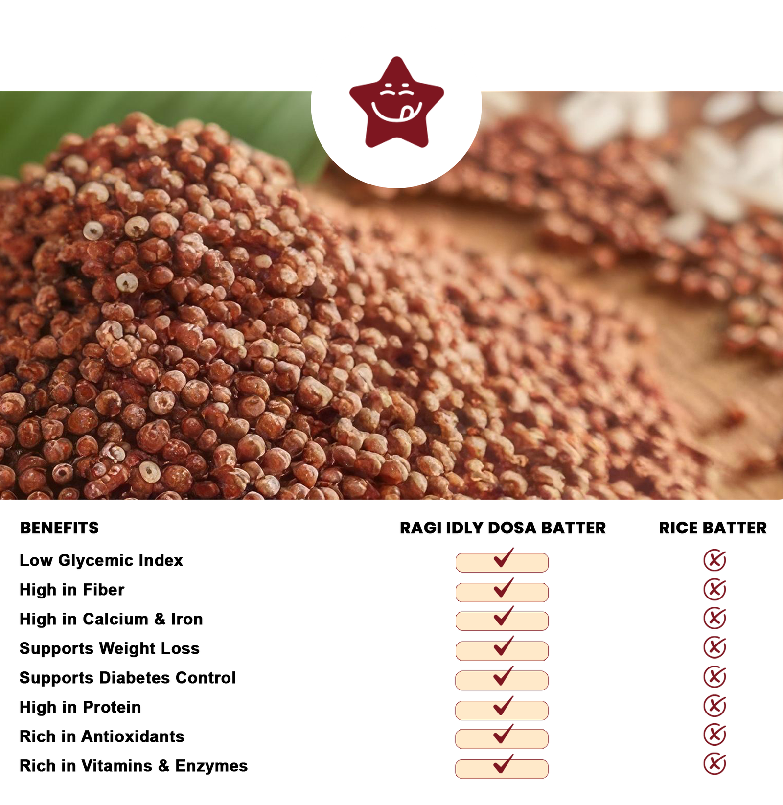 With a low glycemic index, our Ragi batter helps maintain stable blood sugar levels compared to regular Rice batter